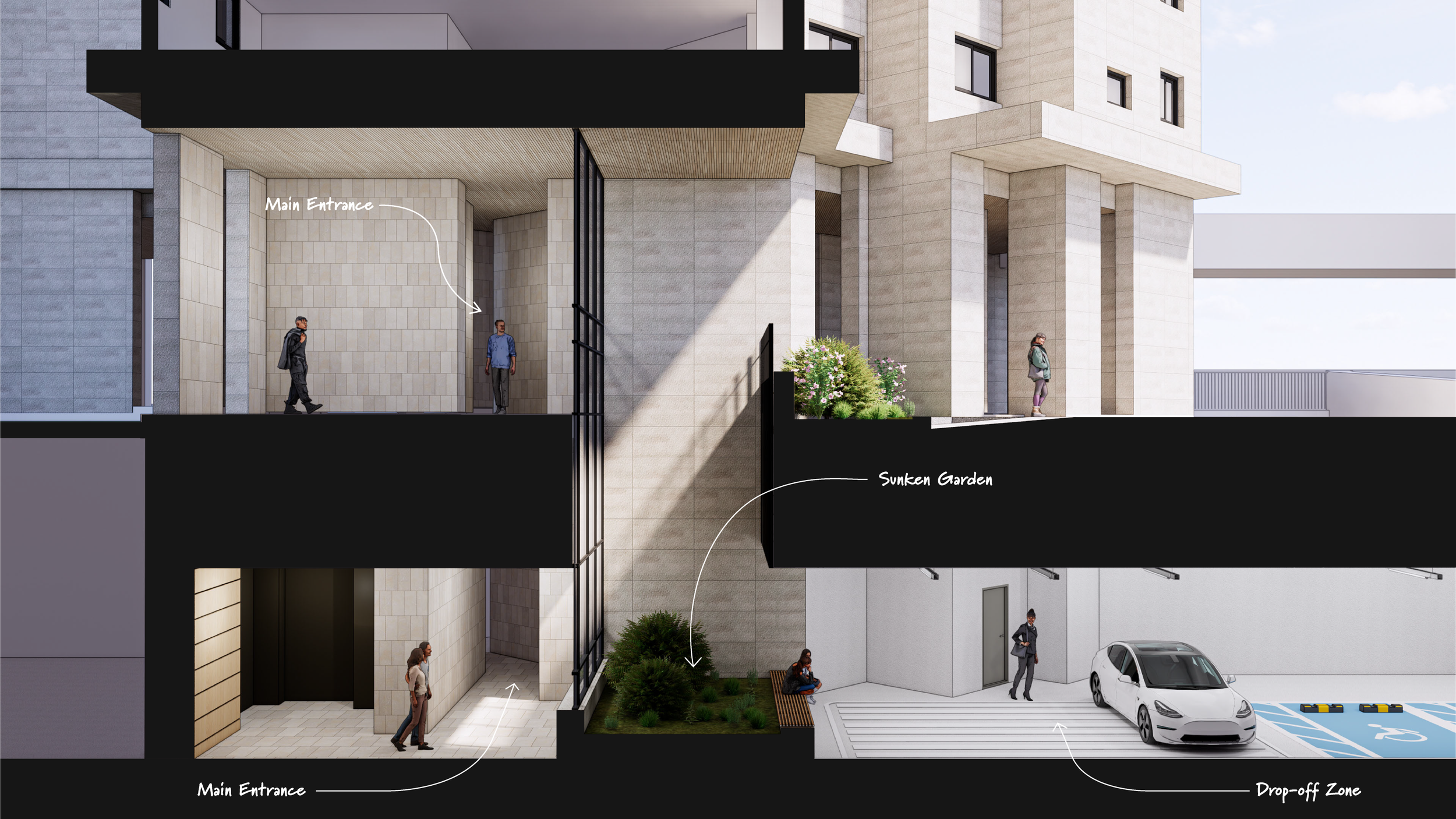 선큰은 지상과 지하 사이에 빛과 공기를 연결하는 수직적 틈이다. 이를 통해 지하주차장 깊숙한 곳까지 자연광이 들어오고, 주차 후 지상으로 이어지는 동선 역시 보다 밝고 쾌적하게 바뀐다. 지하를 단절된 설비 공간이 아니라, 지상과 연속된 생활 공간으로 확장하는 제안이다.