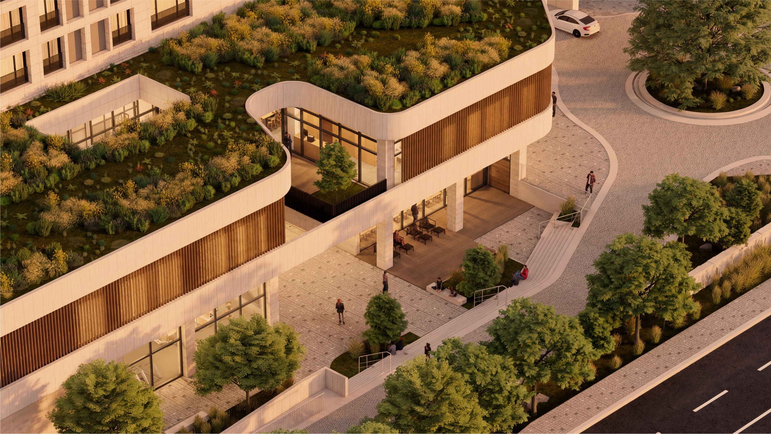 이 주동의 저층부 커뮤니티는 개별 프로그램을 분절된 실들로 나누기보다, 유기적인 곡선의 건축 언어로 하나의 흐름 안에 엮어낸다. 부드럽게 이어지는 매스는 주출입부, 드롭오프, 필로티, 테라스, 선큰, 라운지로 동선을 자연스럽게 연결하며, 주민의 이동이 곧 커뮤니티의 경험이 되도록 만든다. 하나의 커뮤니티동 안에는 머무름과 이동, 노출과 숨김, 개인의 시간과 함께하는 시간이 함께 놓인다. 이는 단지의 주요 거점들을 단순히 배치하는 데 그치지 않고, 서로를 시각적·공간적으로 인지하게 하여 이용의 가능성을 확장하는 방식이다. 곡선으로 엮인 커뮤니티는 독립된 시설의 집합이 아니라, PARK MOMENTS를 만들어가는 하나의 생활 풍경으로 작동한다.