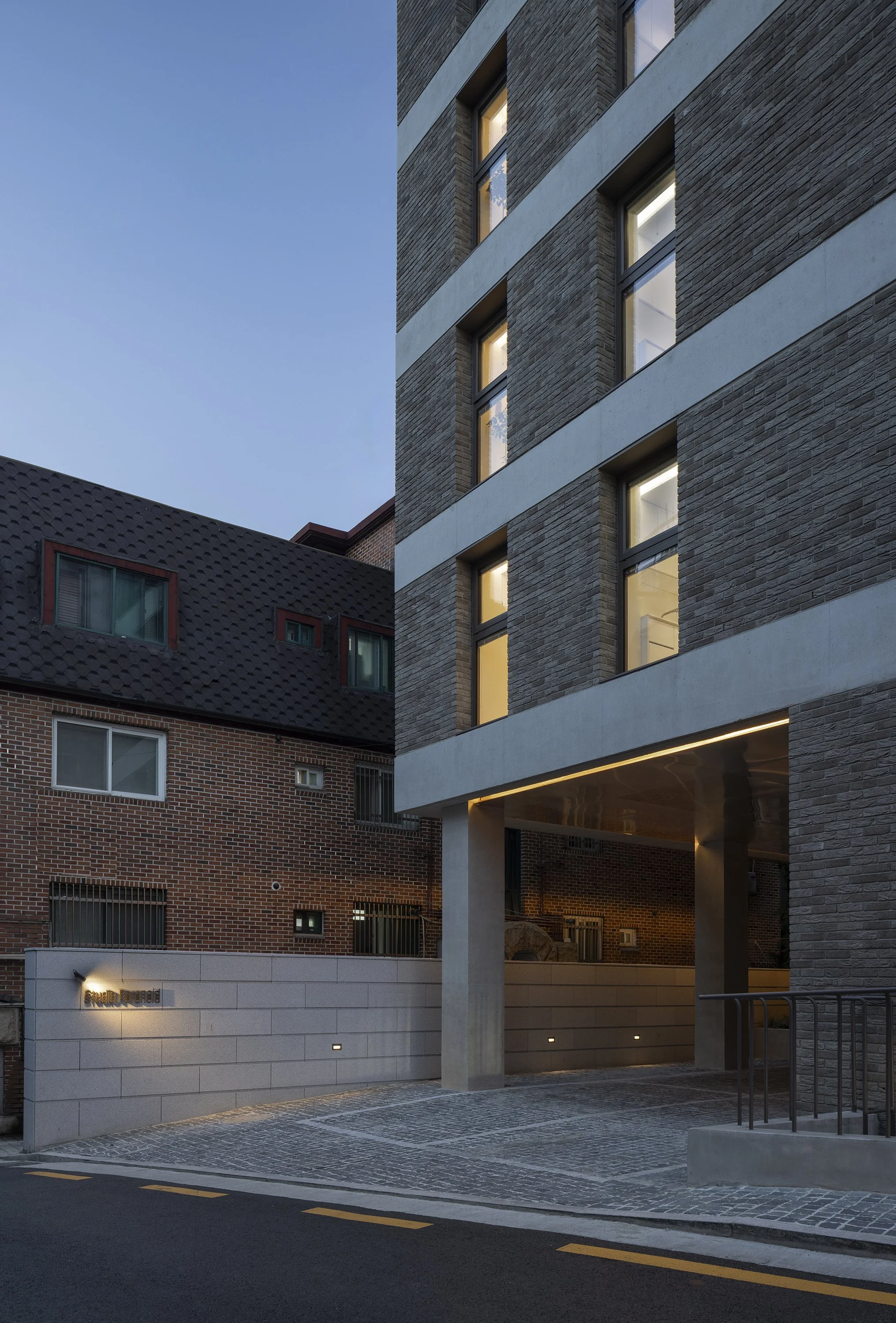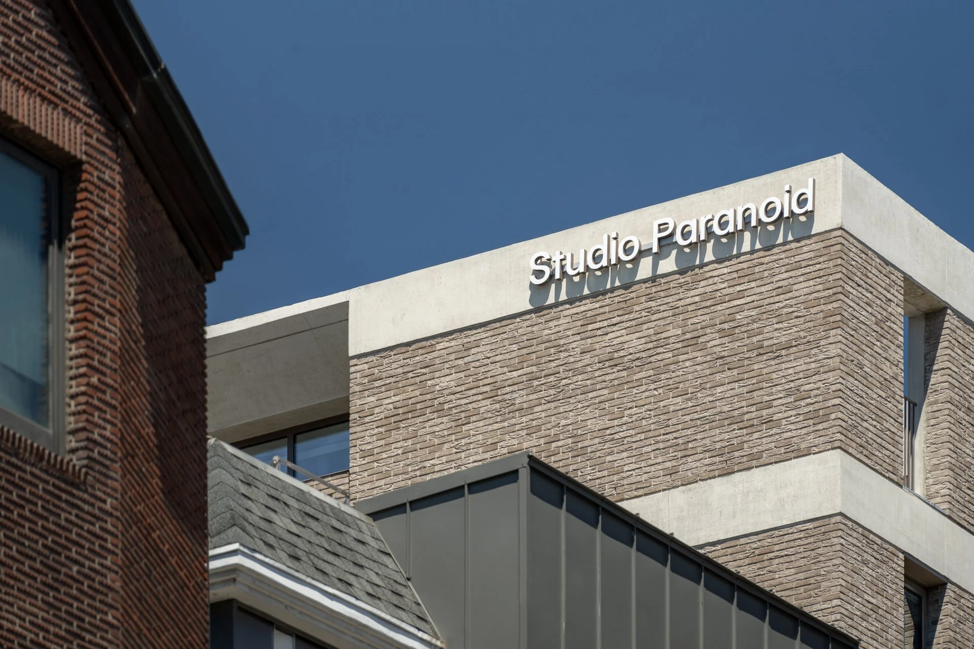 두개의 도로에 접해 있는 모서리 땅은 다양한 얼굴을 가진 STUDIO PARANOID 만큼이나 극적이고 가능성이 있는 대지였다. 3미터에 가까운 레벨차이로 인해 자연스럽게 지하층이 형성되었고 틀에서 벗어나 공간을 입체적으로 사용할 수 있도록 천장고에 변화를 주고 선큰을 계획하였다. 대지진입은 두 곳에서 이루어진다. 동측 도로에서의 진입은 지하층으로 연결되어 지상층과의 프라이버시를 고려하였고, 북측 도로에서의 진입은 수직코어로 이어진다.
