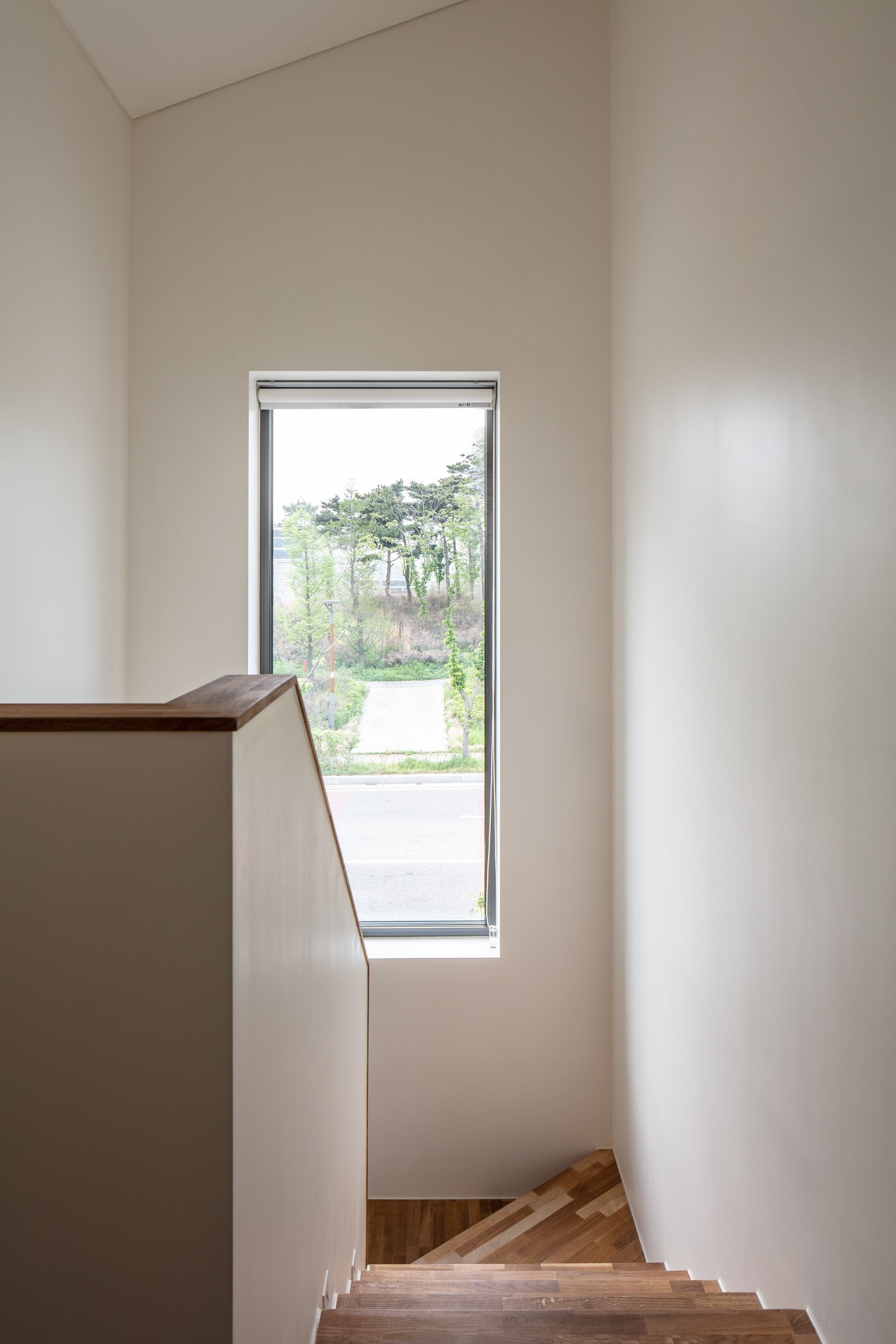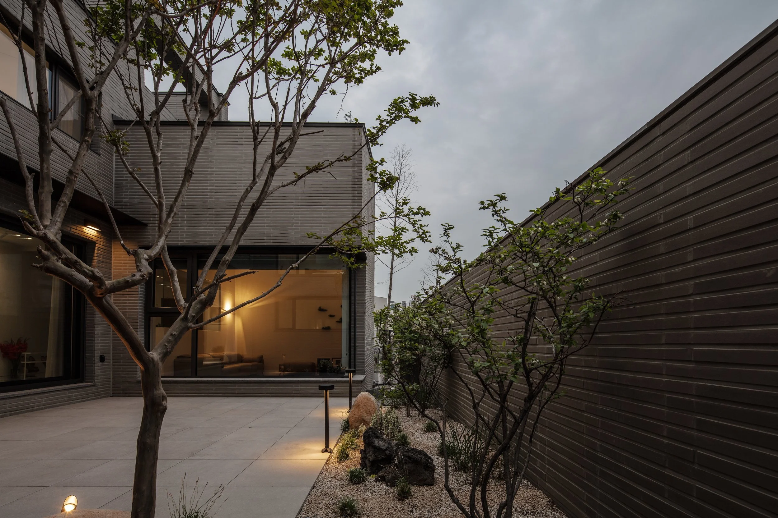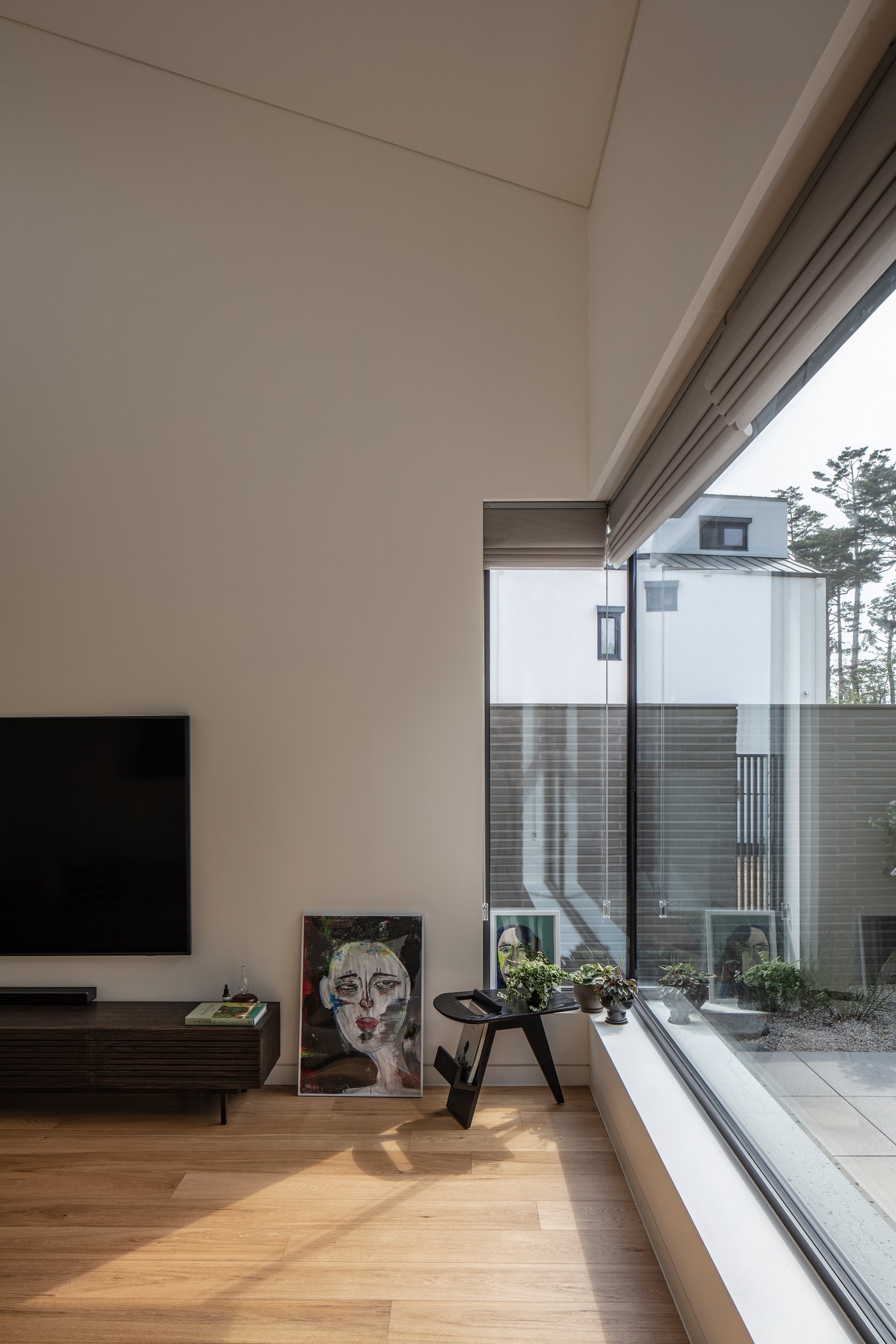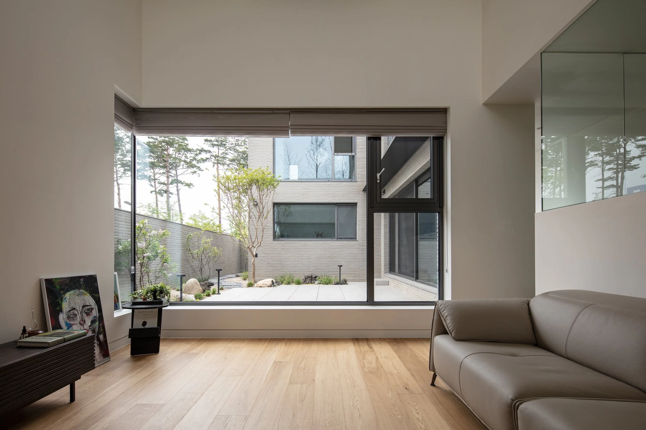 현관에 들어서면 마주하는 스케일감을 벗어난 높은 층고의 거실과 통창을 통해 유입되는 중정은 외관과 대비되는 개방감을 준다. 중정은 온 가족이 향유하는 공간이다. 1층과 2층의 모든 공간은 중정을 향하며 큰 창을 통해 남향의 햇살과 변화하는 자연을 조망할 수 있다. 차고 상부에 배치된 2층 베란다는 두 자녀의 놀이터다. 베란다를 아우르는 외벽은 외부의 시선을 차단함과 동시에 시선을 하늘로 향하게 한다.