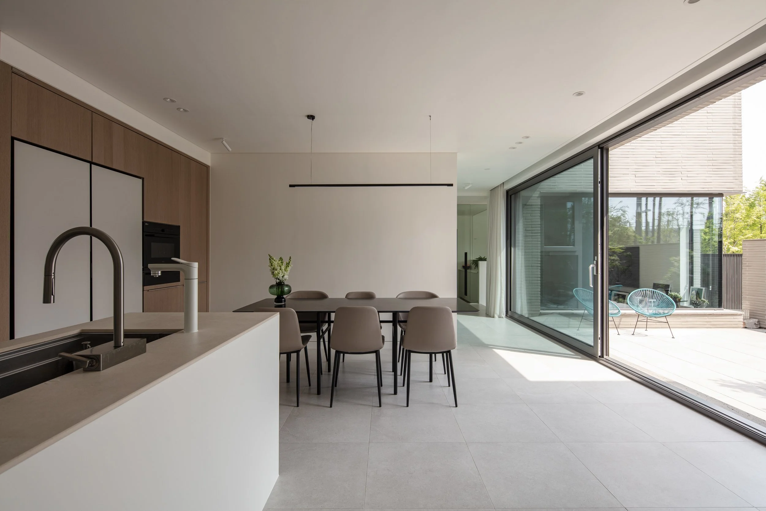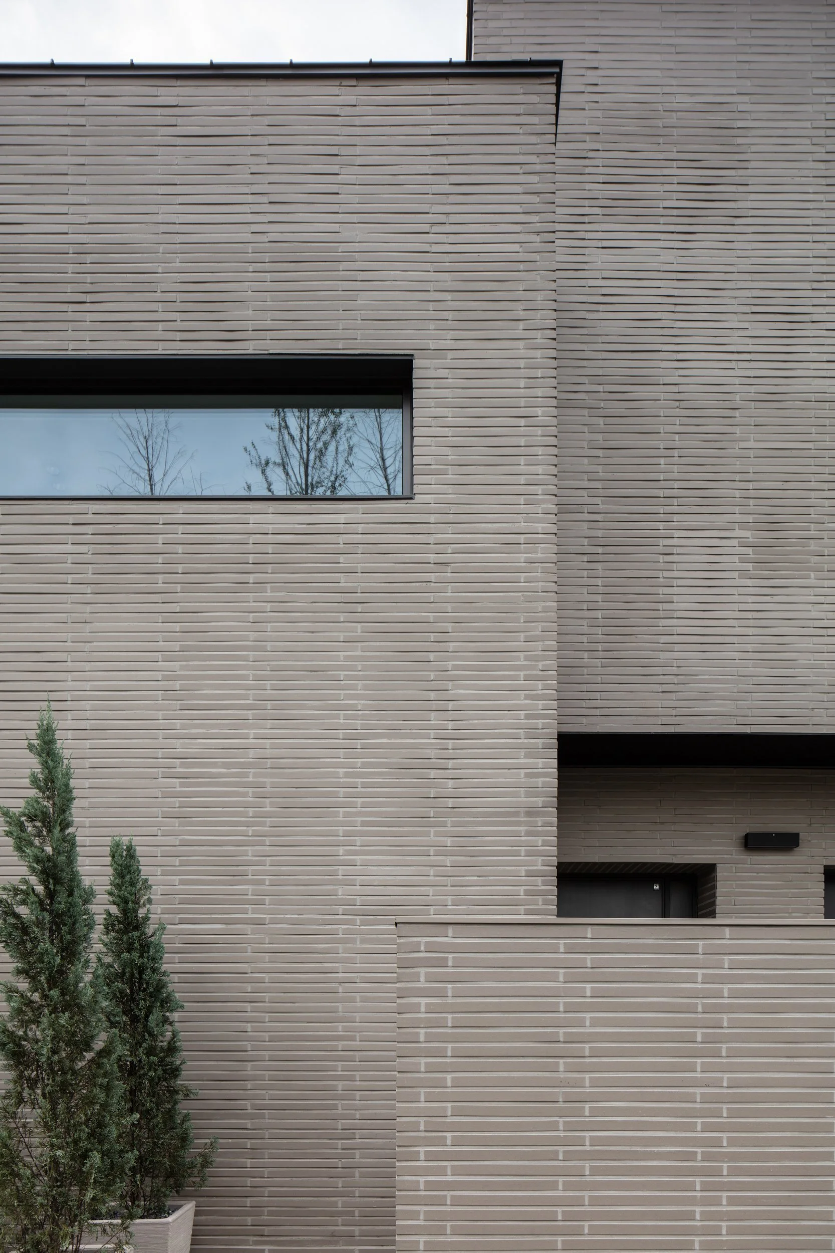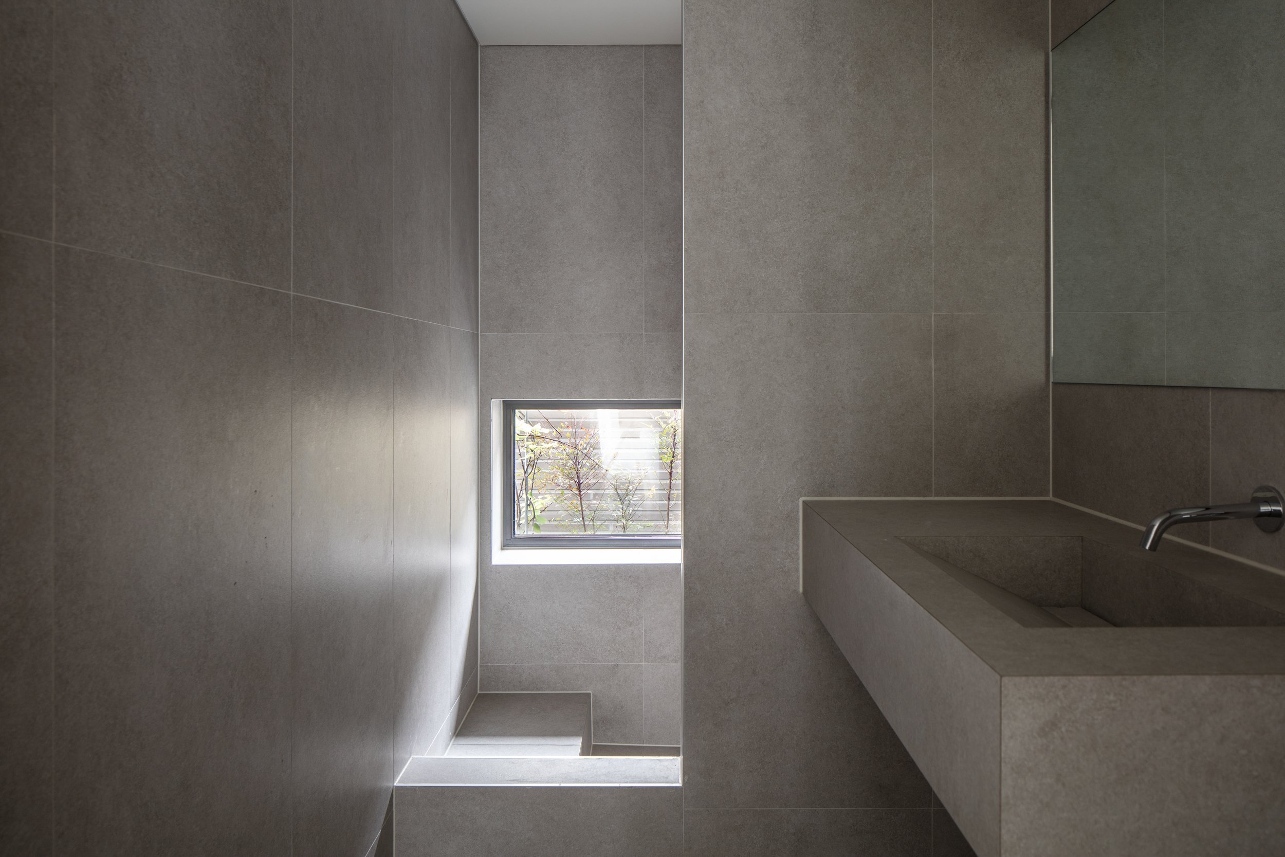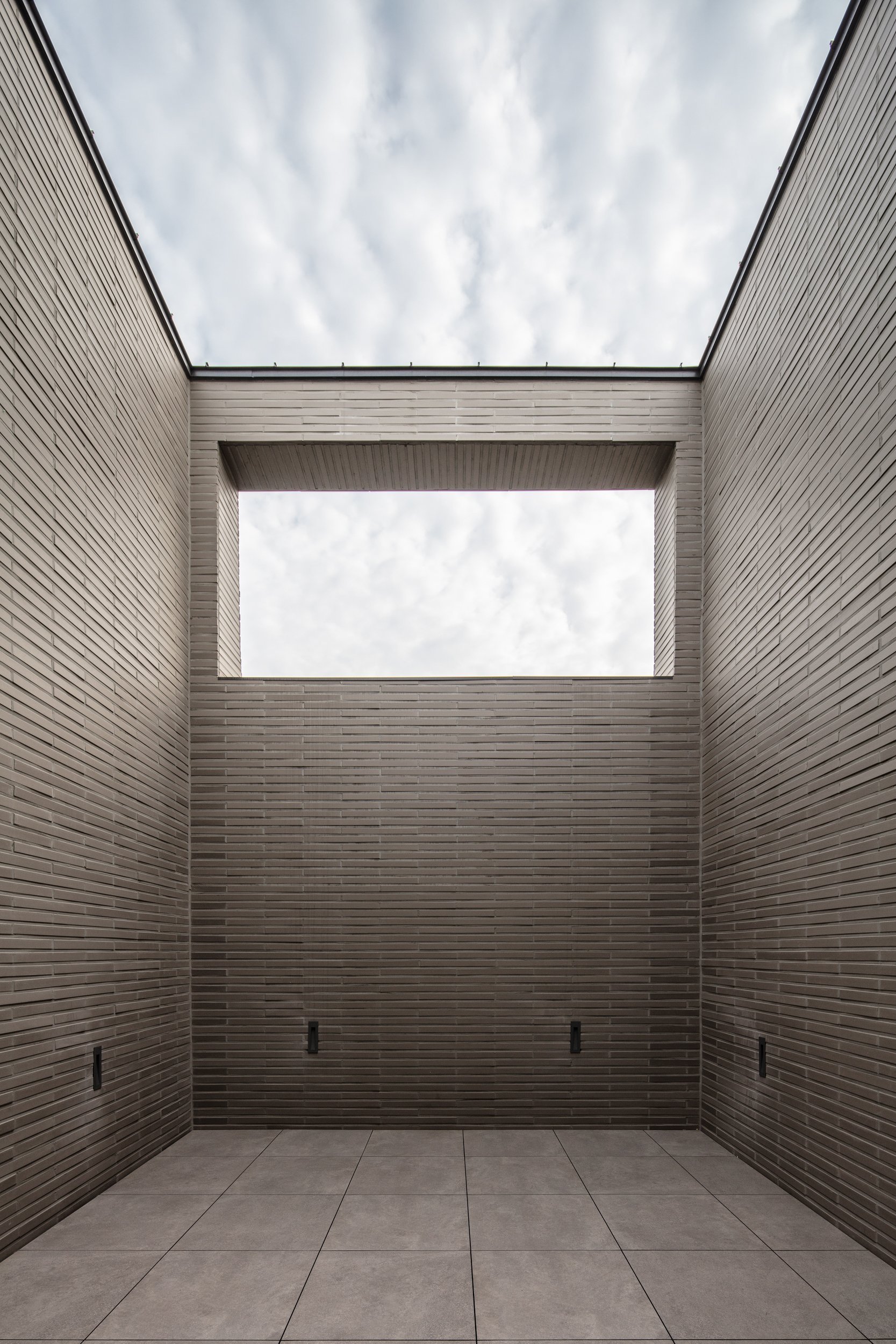 현관에 들어서면 마주하는 스케일감을 벗어난 높은 층고의 거실과 통창을 통해 유입되는 중정은 외관과 대비되는 개방감을 준다. 중정은 온 가족이 향유하는 공간이다. 1층과 2층의 모든 공간은 중정을 향하며 큰 창을 통해 남향의 햇살과 변화하는 자연을 조망할 수 있다. 차고 상부에 배치된 2층 베란다는 두 자녀의 놀이터다. 베란다를 아우르는 외벽은 외부의 시선을 차단함과 동시에 시선을 하늘로 향하게 한다.