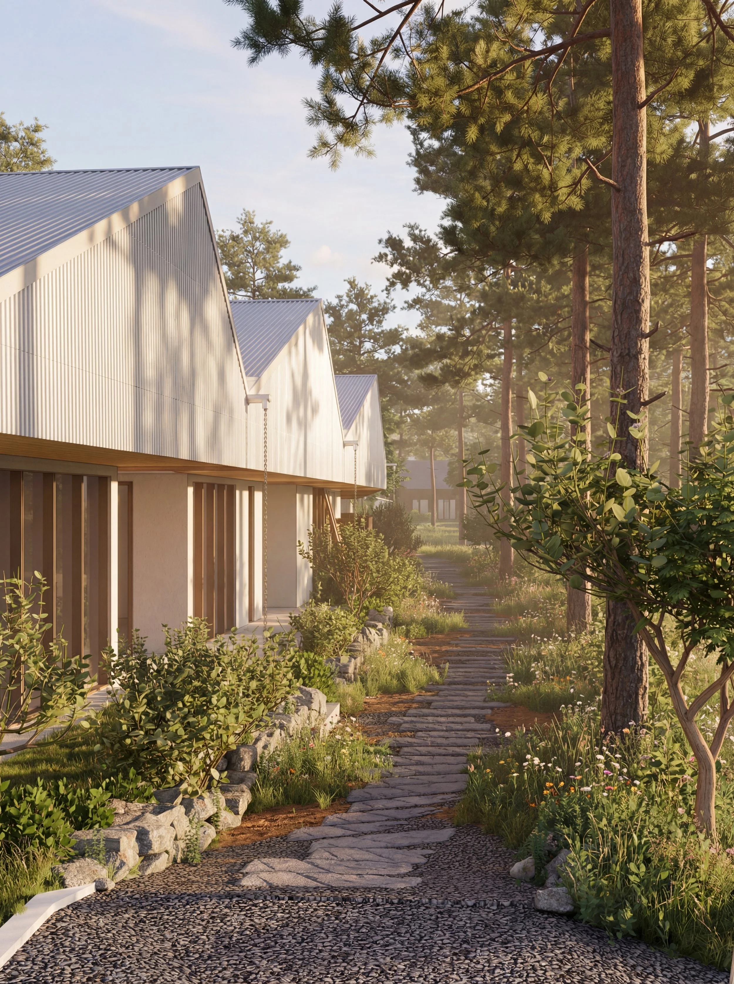 대지는 숲과 들판 사이의 완만한 경계에 위치하며, 건축은 자연과 다시 맞닿는 가장자리에 조심스럽게 놓였다. 건물 뒤편의 녹지 경계(Green Edge)는 주변 자연환경과 부드럽게 연결되며, 지붕 위의 녹화는 풍경 속으로 건축의 존재를 낮춘다. 숙소 앞에는 자연을 따라 이어지는 산책로(Nature Trail)가 계획되어 방문객이 숲의 흐름을 따라 이동하도록 유도한다. 차량 접근 도로와 숙소 사이에는 완충 녹지(Green Buffer)를 두어 외부 환경으로부터의 간섭을 줄이고, 보다 조용한 체류 환경을 만든다. 빗물은 지붕에서 수집되어 자연스럽게 대지로 스며들도록 계획되었으며, 실내 공간은 큰 개구부를 통해 풍경과 시각적으로 확장된다. 이러한 구성은 건축과 자연 사이의 경계를 흐리며, 머무는 경험이 주변 환경 속으로 천천히 스며들도록 한다.