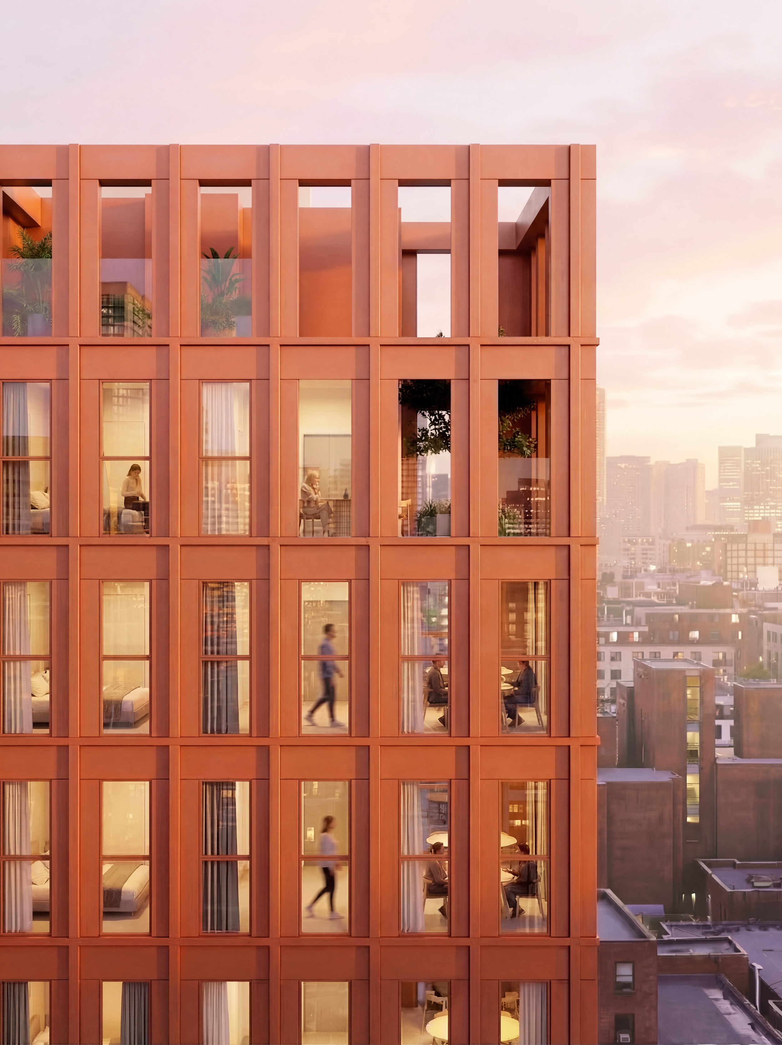반복되는 프레임과 깊이 있는 개구부는 도시 속에 또렷한 기준을 세우고, 따뜻한 색감과 빛의 결은 그 질서 위에 집의 감각을 더한다. 가까이에서는 사람의 움직임과 머무름을 차분히 감싸고, 멀리서는 복잡한 도시 풍경 속에서도 조용히 존재감을 드러낸다. 이 건물은 눈에 띄기 위해 과장되기보다, 익숙한 리듬과 편안한 인상으로 오래 기억되는 도시의 표정이 되고자 한다.