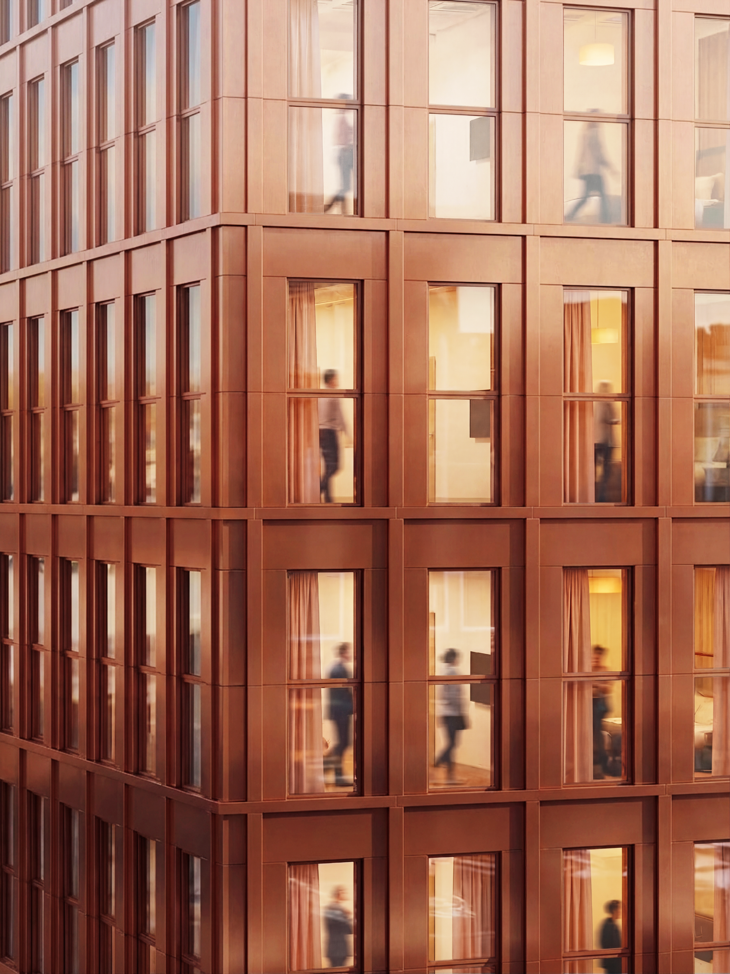 도심 한가운데 선 이 건물은 도시와 거리를 두기보다, 그 삶의 결을 조용히 받아들이는 방식으로 자리한다. 창에 비치는 주변의 풍경과 실내를 스쳐가는 사람들의 움직임은 안과 밖의 경계를 흐리며, 도시의 시간이 숨처럼 자연스럽게 스며드는 장면을 만든다. 그렇게 이곳은 도시를 차단한 채 고립된 쉼이 아니라, 지역의 일상과 연결된 채 머무름의 감각을 깊게 하는 공간이 된다. 동시에 반복되는 입면의 질서와 따뜻한 빛은 복잡한 도심 속에서도 흔들리지 않는 안정감을 만들고, 바깥의 흐름 한가운데에서 오히려 더 고요한 쉼의 밀도를 완성한다. 결국 이 건물은 도시와 하나의 풍경을 이루며, 서두르지 않는 시간 속으로 천천히 몰입하게 하는 머무름의 장소가 된다.