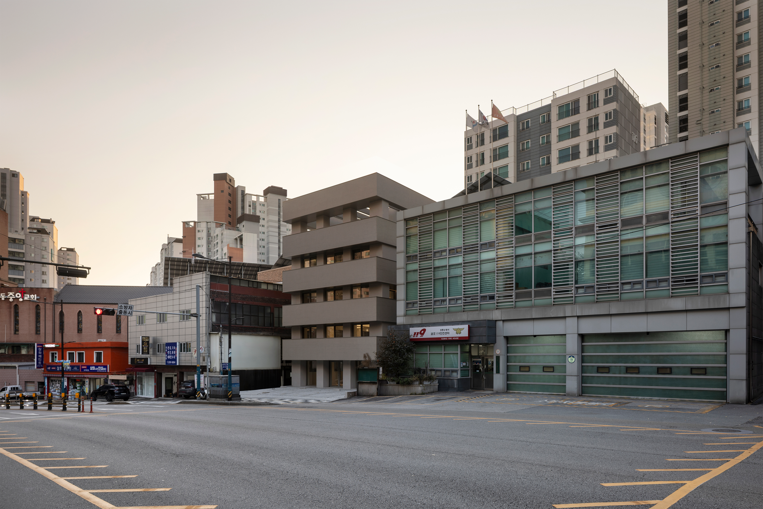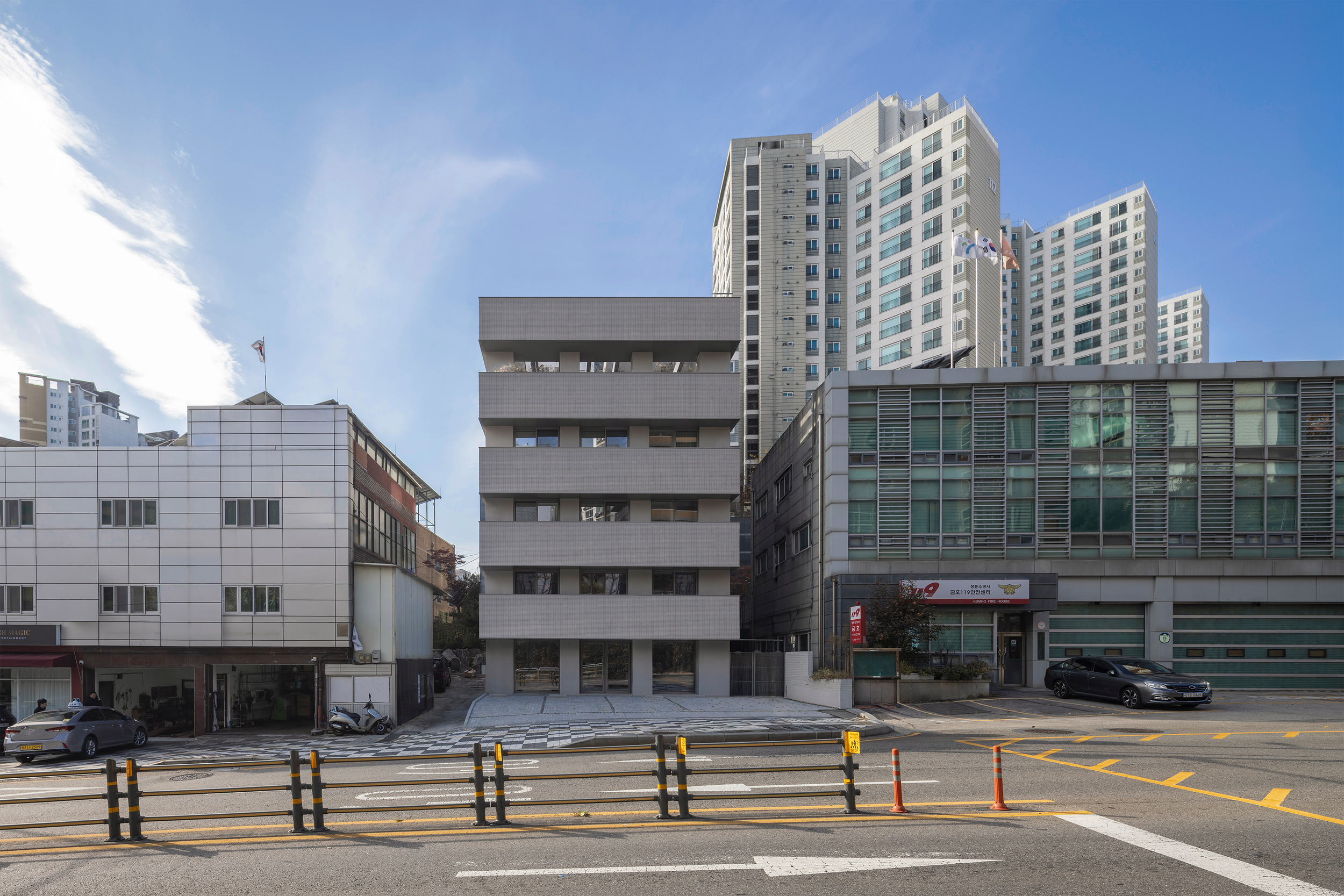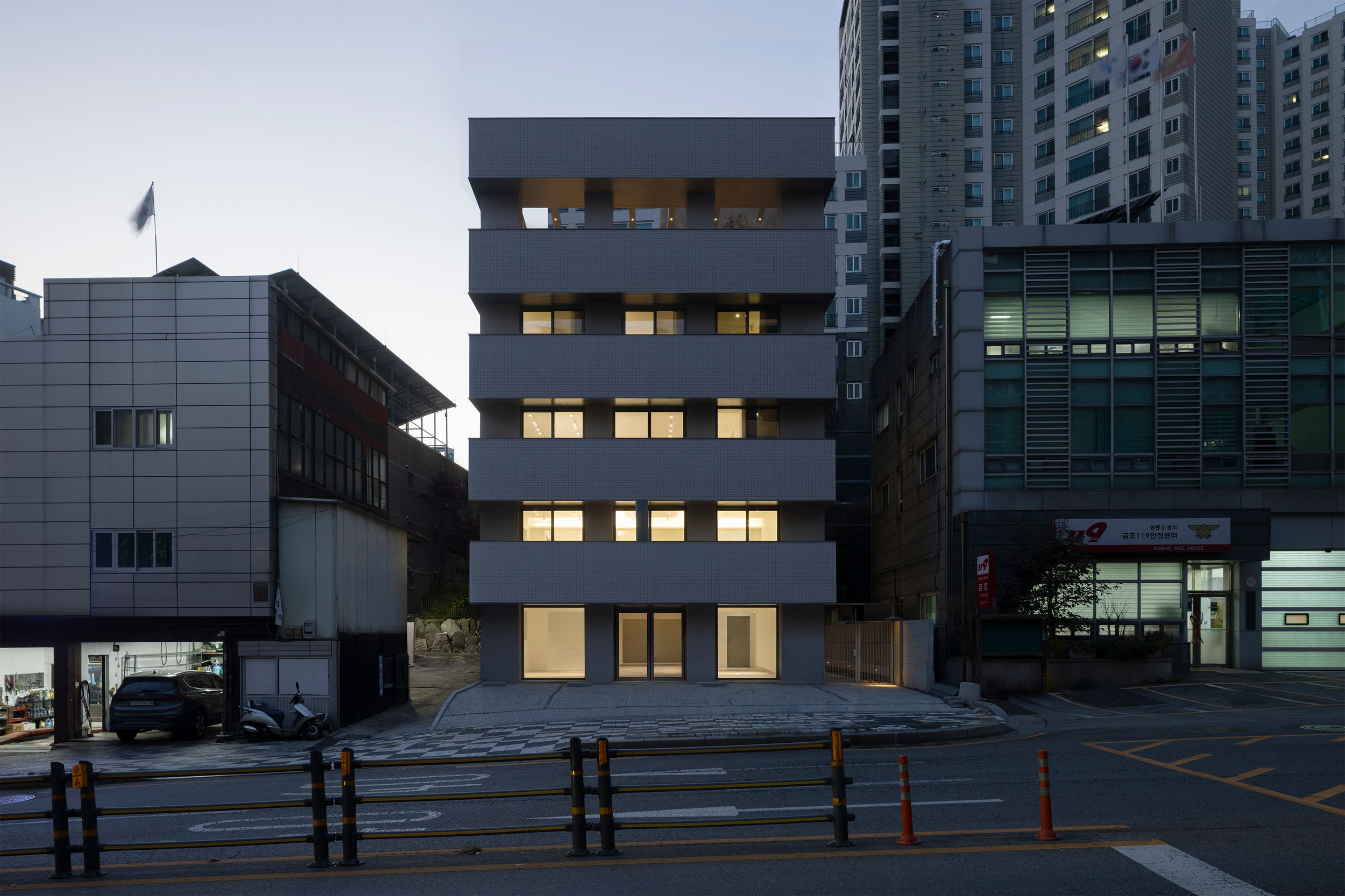 두번째는 주차장으로 인해 후퇴되어 인지성이 떨어지는 건축물의 배치였다. 인접건물에 비해 상대적으로 후퇴되어 있는 배치는 상권이 활발하지 않은 지역에서 더욱 단점이 되었다. 건축물 정면의 존재감을 드러내기 위해 가장 먼저 주차장과 함께 대지 전면에 돌출되어있는 지하 계단실 구조를 과감히 철거하고 별도의 피난동선을 후면에 확보해주었다. 동시에 숨은 면적을 최대화하고 매스를 최대한 앞으로 돌출시키기 위해서 동측면에 전층 발코니를 계획하였다. 각 층 발코니는 넓은 전면도로를 통한 경관과 채광을 만끽할 수 있는 추가적인 외부공간을 제공한다.